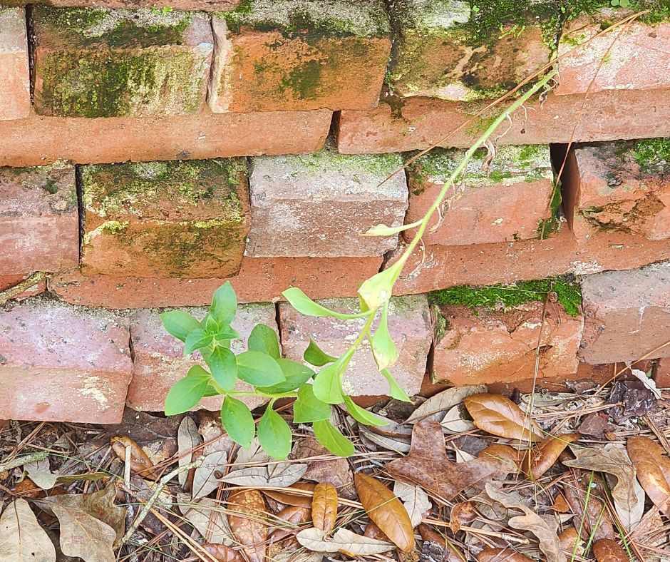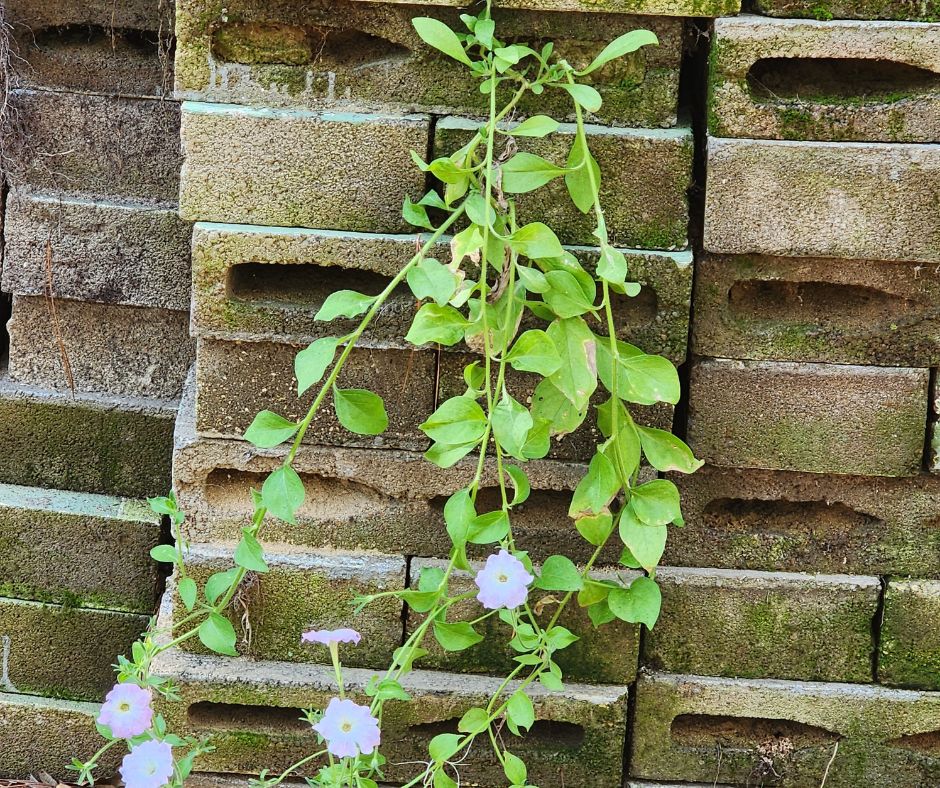 Last year, we disassembled our block and brick patio during the Christmas holidays. Brick by brick and block by block, my family loaded my beloved resting place on the wagon and carried it to the backside of nowhere. Last month, I walked to the branch with my dogs and was surprised to find petunias growing from the stacks.